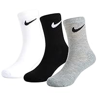 Nike Kids 3 Pack Basic Crew Socks in White, Black and Dark Grey Heather. Pack of 3 pairs of cotton-rich stretchy socks from Nike that offer soft comfortable support for a wide variety of activities. Ribbed design and a crew length, the reinforced heel and foot allow these socks to be suitable for most footwear. Contrast Nike Swoosh branding. Pack of 3 pairs of socks. Multi Size - 9.5-2.5 - Manufacturers part number: UN0027