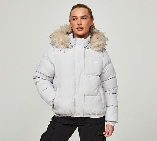 Closure London Womens Fur Hooded Puffer Jacket in Stone. Perfect for keeping you warm and stylish all winter long. The faux fur hood adds a touch of luxury, while the quilted design and simple clean aesthetic make this jacket a statement piece. Constructed from a durable, water-resistant fabric that will keep you dry in light rain, a full zip closure and a faux fur lined hood for added warmth and style. White Size - 8