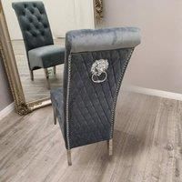 Emma Tall Velvet Lion Knocker Dining Chair Luxury High Back Design Add a touch of class and sophistication to your dining space with the Emma Dining Chair, a statement piece that perfectly blends elegance, comfort, and craftsmanship. Upholstered in sumptuously soft velvet, the Emma Chair features a tall scroll top backrest with deep button-tufted detailing, exuding timeless luxury. The quilted stitching on the back adds a refined finish, while the chrome lion head knocker makes a bold, glamorous stateme...