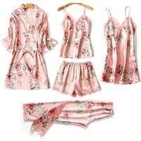 Fabric: 100% polyester. Satin pyjamas: Get a beautiful five-piece floral satin nightwear set. Floral design: Featuring a stunning pink floral print with green foliage, plus a delicate lace trim finish. Features: Soft and lightweight with elasticated waists and a silky smooth feel. Nightwear: A glamourous nightwear set for romantic nights in. Set includes: A short dressing gown, vest, shorts, trousers and nightdress. Sizes: Choose from ladies UK sizes 8-18.