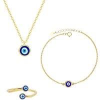 Our Evil Eye Gold Plated Necklace, Bracelet, and Ring Gift Set for Her offers a stunning trio of protective jewellery, designed to ward off negative energy while adding a touch of elegance to any outfit. Each piece is beautifully crafted with high-quality gold plating, showcasing the iconic evil eye motif, known for its symbolism of protection and good fortune. This versatile set is perfect for everyday wear or special occasions, making it an ideal gift for birthdays, anniversaries, or any meaningful mo...