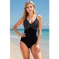 This swimsuit showcases a chic crossover design with a plunging V-neckline, striking the perfect balance between elegance and sexiness. The polka-dot upper contrasts beautifully with the solid black lower half, blending vintage charm with modern sophistication for a flattering, slimming effect. Effortlessly stylish, it pairs seamlessly with a wide-brimmed hat, sunglasses, or sandals, making it a must-have for beach days, honeymoons, pool parties, and water adventures. Slip into this piece and embrace ev...