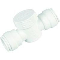 Push-fit fitting for the connection of plastic and copper pipe. The valve allows isolation of appliances such as a washing machine or dishwasher for maintenance or installation. Simply push the valve fully on to the pipe and thread the appliance hose on to the valve.