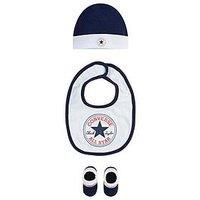 Converse Converse Younger Chuck Infant Hat Bib Bootie Set 3pc The Converse Set is all about the accessories. This trio includes a hat, bib and booties made of soft knit fabric for all-day comfort. The bib features touch closures at the neck for easy on and off. The fold-over cuffs on the beanie and booties offer littles a customizable fit. Matching Chuck patch logos give them a coordinated look. Material Content: Bib/Hat: 100% cotton. Booties: 62% cotton, 34% polyester, 4% elastane Washing Instructions:...