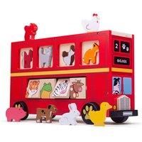 Drive the colourful collection of wooden animals around town in this beautifully-crafted Shape Sorter Bus. The animals can be posted through the correct slots on the side panels, while passengers on the lower deck can be switched using the window slider.At the end of the journey the animals can be unloaded via the door at the back of the wooden shape sorter bus. Sorting toys encourage mobility, discussion and creative play.Consists of 21 play pieces.