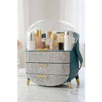 This Nordic-style makeup storage box is adorned with sparkling rhinestones on its surface, combining practicality and aesthetics. The top compartment offers ample storage space for various skincare products, keeping your tabletop neat and orderly. Two independent drawers at the bottom provide extra storage, perfect for sorting lipsticks, eyeshadows, makeup brushes, and other small items. Designed with four sturdy feet, it ensures stability on any surface. The transparent top cover not only allows a clear view of the contents but also effectively protects them from dust. More than just a storage box, it serves as an attractive decoration for any tabletop. | SHEONLY Countertop Portable Oval Makeup Storage Box with Transparent Cover in Green - Manufacturers part number: SHEONLY_0694162610544