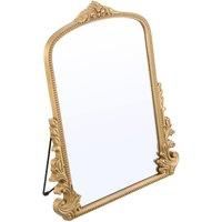 This decorative mirror features carved patterns on its frame, exuding classical elegance and artistic value. Made from copper-free materials, it ensures safety while reducing heavy metal pollution. The mirror surface offers high reflectivity and lasting clarity, making images brighter and more true-to-life. The use of PVC material on the back provides excellent moisture and mildew resistance. Smooth and rounded edges without sharp corners guarantee safety during use. Whether in bedrooms or entryways, it seamlessly integrates, serving as both a functional item and a decorative piece of art, adding a touch of unique charm to your home. | Living and Home 41x51cm Baroque Style Gold Vanity Mirror with Stand with Ornate Leaf & Scrollwork Carvings - Manufacturers part number: Living and Home_0694162622981