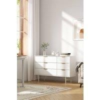 This white storage cabinet with three-dimensional stripes is a striking product featuring a modern and stylish design. It includes six spacious drawers, ideal for organizing clothes, scarves, and accessories. Supported by a sturdy base with a smooth finish and decorated with elegant gold handles, this cabinet adds a touch of sophistication and style to your space. | Freestanding Storage Cabinet - 6 Textured Drawers in White