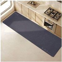 Keep your kitchen clean with this absorbent mat! Utilising rapid polymer absorption technology, it quickly traps oil and water, keeping your kitchen floor clean, dry, and safe. Made from soft diatomaceous earth, it offers exceptional absorbency, keeping your feet dry. It is breathable and quick-drying, preventing mould and odours. It is soft and springy, providing a luxurious underfoot feel and bounces back with every step. The seamless, one-piece construction eliminates curled edges for a neat look. With its modern minimalist design, it complements any kitchen. Versatile and practical, it is perfect for use in kitchen, bathrooms, or doorways, providing all-around protection and comfort. | Living and Home Soft Absorbent Diatomaceous Earth Kitchen Mat Rug in Navy | Size: 45cm x 120cm