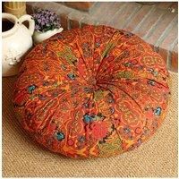 Infuse any room with a burst of colour and comfort using this generously proportioned floor cushion. Featuring a plush round shape, the cushion showcases vibrant hues complemented by intricate patterns that evoke a sense of artistry and exotic flair. A button-tufted centre creates natural folds, enhancing both the visual appeal and the supportive feel of the cushion. Ideal for a variety of settings such as living rooms, bedrooms, balconies, or tea rooms. | Living and Home Bohemian Style Round Tatami Floor Seat Cushion in Orange
