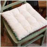 Instantly revitalise your dining chairs with this charming seat cushion. Featuring a simple solid colour design, this cushion combines playful details with practicality. Subtle texturing across the vintage-inspired surface adds visual interest and a pleasing tactile quality. Surrounding the edges are vibrant pom-poms, infusing a lively atmosphere that instantly breathes new life into ordinary chairs. Perfect for family gatherings or casual dining, this cushion transforms any meal into a joyful occasion. | Living and Home Bohemian Tasseled Square Dining Chair Cushion in White | Size: 40cm x 40cm - Manufacturers part number: Living and Home_0694162643047