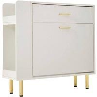 Elevate your entryway with this sophisticated shoe cabinet. It features a clean, warm white finish for a minimalist yet high-end look. Luxurious gold metal legs and long handles add a touch of understated opulence, seamlessly blending with Nordic, modern, or cream dcor styles. Beyond its beauty, the top drawer neatly stores small items like keys and shoe accessories, while the lower flip-down section offers easy, bend-free access to shoes while keeping them hidden. A handy open side shelf is perfect for displaying decor or temporary items. Versatile enough for hallways, apartments, or bedrooms, it serves beautifully as a shoe cabinet, storage unit, or side console. | Living and Home Golden Accent Multifunctional Storage Shoe Cabinet in White - Manufacturers part number: Living and Home_0694162644259