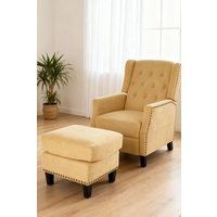 Enjoy comfort with a pushback reclining chair and matching footstool designed for relaxation and elegance. Exquisite nailhead trims define its silhouette and showcase craftsmanship and attention to detail. The subtly winged backrest and button-tufted detailing create a sophisticated profile, making it a striking centrepiece in any living space. Generously padded cushions deliver lasting comfort and optimal support, ensuring hours of ease. A gentle push activates the reclining mechanism, extending the footrest to provide relaxed leg support. The coordinated footstool offers a versatile complement, ideal for unwinding after a busy day, reading, or simply enjoying a moment of calm. | Living and Home Fabric Sofa Pushback Reclining Armchair with Footstool in Yellow - Manufacturers part number: Living and Home_0694162646055