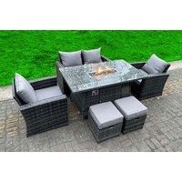 Stylish: Dark grey mixed rattan with dark grey fabric for a modern look. Durability: Made from sturdy powder-coated rattan for long-lasting bliss. Outdoor Rattan: Get a rattan 6-seater garden love sofa furniture set! Quality Comfort: Extra soft, thick cushions with removable cushion covers! Garden Upgrade: Enjoy comfort with an ergonomic design and innovative features for relaxing summers! Includes: Two-seater love sofa, two armchairs, two stools and one dining table with fire pit.