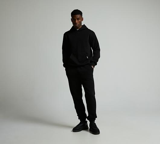Closure London Relaxed Fit Suit in Black. A suitably relaxing way to start a relaxing day as Closure London bolsters your everyday casual attire with this minimally presented 2-piece set. The top half is an overhead hoodie complete with fixed hood, ribbed cuffs and hem and front kangaroo pouch pocket for your hands or stowing away your small belongings. The matching bottoms come equipped with an elasticated adjustable drawstring waistband for a great custom fit, ribbed cuffs and handy open side pockets....