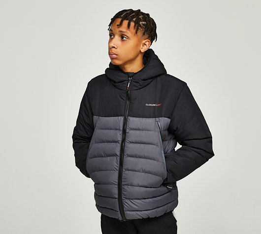 Closure London Junior Contrast Puffer Jacket in Black. A great option for a stylish and affordable winter jacket, filled with 100% polyester for added warmth the outer is made from a water-resistant polyester. Featuring a fixed hood, secure cuffs and pockets to side. A contrast red zipper front and tonal red printed graphic to left leg. Black Size - M/B