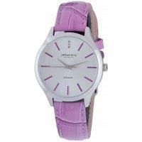 3 genuine diamonds at 12 o'clock Herlev Silver Watch. Silver-tone stainless steel case with a purple leather strap. Fixed silver-tone stainless steel bezel. Silver-tone dial with silver-tone hands and index hour markers. Dial Type: Analog. Quartz movement. Scratch resistant mineral crystal. Push/pull crown. Solid case back. Round case shape, case size: 35 mm, case thickness: 8 mm. Band width: 16 mm, band length: 7.5 in. Buckle clasp. Water resistant at 30 meter / 99 feet. Functions: hour, minute, secon...