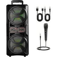 Bluetooth Streaming: Pair wirelessly with your phone, tablet, laptop, or TV. Immersive Stereo Sound: Dual 6.5-inch drivers deliver rich bass and clear highs. Sleek & Portable: Compact design with carrying handle for events anywhere. Simple Controls: Effortlessly manage playback and modes on the go. Karaoke Ready: Includes a quality wired microphone for instant sing-alongs. Dynamic LED Party Lights: Lights pulse to the beat for lively gatherings. Multiple Playback Modes: Easily play music via USB...