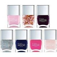 Dress your nails in glitzy shades with chunky confetti and holographic glitter, plus tones of magenta, lilac and navy. It's the perfect party season gift, all packed away inside the giftable disco box. As always, each polish features our patented wide hugging brush for flawless application. To amp up the disco vibes, shade Head To Toe Glitter is packed with holographic power pigment to shimmer and shine from all angles under the party lights. Whip out your phone torch or use a ring light to bring it to life! Opt for all-out XL confetti mani with our Dare To Disco nail topper, or apply two or three particles to a single nail before your next party plan. Shades: - Lilac: Feeling Fireworks - Copper confetti: Dare To Disco - Deep plum: Best Dressed Award - Silver holo glitter: Head To Toe Glitter - Navy: Don't Stop Dancing - Magenta: She's Super Chic - Base Glow nail treatment | Debenhams Let's Go Disco 7-Piece Nail Polish Gift Set