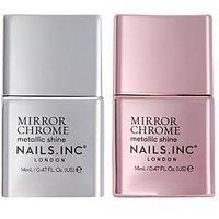 Nails Inc Nails Inc Mirror Chrome Duo (Value £22) Reflect the light with our high shine chrome nail polish. Formulated for ultra at home chrome, easily achieved with just one swipe of the polish. A molten metallic mani in the making... Silver Serve is a silver chrome shade You're Being Chromatic is a pink chrome Each can be applied easily to create an immaculate finish, using the patented, wide hugging brush exclusive to Nails.INC, ergonomically designed to work with the shape of the nail and minimize ... - Manufacturers part number: WS7W0