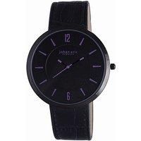 Miyota 2035 Quartz movement Vejle Denmark Watch. Black IP stainless steel case with a black calfskin leather strap. Fixed bezel. Black dial with black and purple hands and Arabic/index hour markers. Dial Type: Analog. Quartz movement. Miyota 2035 engine. Scratch resistant mineral crystal. Case diameter: 41 mm. Case thickness: 7.5 mm. Round case shape. Band width: 19 mm. Buckle clasp. Water resistant at 30 meters (100 feet). Functions: hour, minute, second. Johan Eric Vejle Black Dial Black IP Steel Ladi...