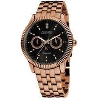 The Radiance Diamond watch is a bold expression of luxury and precision. Crafted with a rose gold-tone case and matching bracelet, this timepiece showcases a refined and contemporary design. The black dial serves as a striking contrast to the rose gold-tone hands and hour markers, enhancing visibility and sophistication. A diamond-accented 12 oclock marker adds a touch of brilliance, while dual sub-dials provide functionality for day and date tracking. The moon phase complication at 6 oclock introduces ...