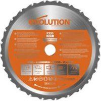 - Product Information This Evolution Rage carbon steel circular saw blade is suitable for aluminium, mild steel, plastic and wood. It's compatible with evolution power tool saw. It has a tct blade. It's 255mm in diameter and 1.4mm thick, with a disc bore of 25.4mm. Features and Benefits Designed to cut mild steel, aluminium, plastics & wood, even wood containing embedded nails with a single RAGE blade! Perfect for cutting hard and softwood, decking, laminate flooring, mild steel angle,