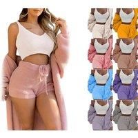 Sizes: Choose from women's UK sizes 8-16. Three-piece set: A hooded cardigan, cropped top and high waist shorts. Super soft: A gorgeous fluffy co-ord made from super soft and stretchy fabric. Perfect for: Ideal for lounging at home and sleeping in. Fabric: 95% polyester and 5% spandex. Seven colours: Choose grey, beige, purple, pink, yellow, red or black. Fluffy pyjamas: Cosy up at home with this soft and warm pyjama set.