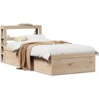Get a better restful night's sleep from this bed frame! It makes a welcoming addition to any bedroom. Stable and long-lasting frame: Solid pinewood is known for its strength and durability. Its straight grains and distinctive knots contribute to its rustic charm.Slatted base for optimal support: The bed frame is equipped with a slatted base for support and breathability for your mattress.Ample storage space: This sleek headboard of the bed features two convenient shelves, offering ample storage space t...