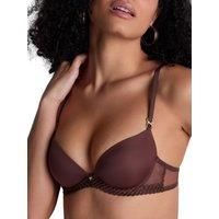 Aubade Sheer Emotion Moulded Push-Up Bra. Underwired plunge bra bra with lightweight moulded cleavage enhancing cups, shimmering fabric, a comfortable semi sheer mesh back, and intricate embroidery. Matching briefs available. This item is recommended for hand wash only. | Aubade Women's Sheer Emotion Push-Up Bra in Brown | Size: 34B