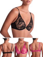 Aubade Sweet Euphoria Triangle Plunge Bra. Underwired non padded plunge bra with a high apex, low plunge triangle shape, sheer embroidered cups, delicate tulle, intricate floral embroidery and matching briefs available. This product is recommended as hand wash only. | Aubade Women's Sweet Euphoria Triangle Plunge Bra in Pink | Size: 32B