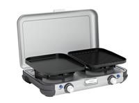 A compact and versatile cooking and grilling companion, the new Camping Kitchen 2 Grill & Go features a 2 burner stove with interchangeable searing grids and plancha providing the flexibility to support all your food preparation needs. With one grid, one plancha griddle and two pan supports included for cooking, frying, boiling, or grilling, this stove gives you the ability to cater when grilling inspiration hits. The stove is easy to store and transport in its included carry bag. - Manufacturers part number: Camping Kitchen 2 Grill & Go R
