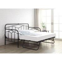 The Axton bed frame blends a traditional Art Deco design with a modern, geometrically designed headboard and footend. Made from hard-wearing steel the frame is finished in a choice of Black or Antique Bronze. The bed comes with a pull out trundle, making ideal for guest rooms. Features: Sprung slatted base Underbed clearance approx 35cm All pieces delivered flat packed for self assembly in 2 boxes Box 1 210 x 90.5 x 11 (25kg) Box 2 191 x 54 x 9 (14kg) Specifications: Dimensions: H:110.0 x W:100.5 x D:20...