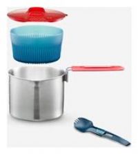 Made of highly durable lightweight stainless steel. Complete for 1 person (1 folding spoon/fork, 1 bowl, 1 lid/strainer). Compact, lightweight and easy to store in a backpack.