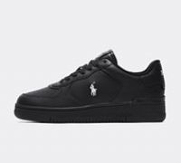 Ralph Lauren Masters Court Trainers in Black and White. Seeping lush premium mastery from each and every orifice comes this exquisite silhouette that elevates Polo's classic low-top trainer. With a secure lace fastening closure, perforated upper, cushioned ankle collar, rounded toe, padded terry insole, and a reinforced heel complete with a leather heel clip. Embellished with a signature Pony logo to outer side, debossed leather tongue patch, debossed 'Polo' to heel, EVA midsole and robust rubber out...