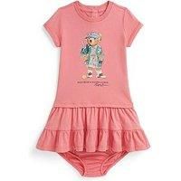 Polo Ralph Lauren Baby Girls Bear Tier Dress Size & Fit Available in sizes 3 Months - 18 Months Details Baby Girls Bear Tier Dress by Polo Ralph Lauren Pink Crew neck Short sleeves Button back fastening Tiered skirt Graphic print Elasticated waist briefs Material & Care Material Content: 100% Cotton Washing Instructions: Machine Washable