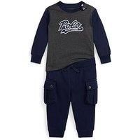 Polo Ralph Lauren Baby Boys Jog And Sweat Set Size & Fit Available in sizes 3 Months - 24 Months Details Baby Boys Jog And Sweat Set by Polo Ralph Lauren Dark Grey Round neck Long sleeve Printed branding Popper fastening Cuffed joggers Elasticated waistband Cargo pockets Material & Care Material Content: Top: 100% Cotton / Bottom: 80% Cotton, 20% Polyester Washing Instructions: Machine Washable