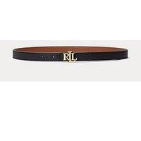 Lauren Ralph Lauren reversible belt crafted from supple pebbled leather. The belt is designed with a gold-tone brass ‘LRL’ logo buckle that can be flipped to show a black side or the tan coloured reverse. Finished with a squared tip. Leather Belt Width: 2cm