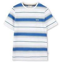 BOSS Boys Stripe Short Sleeve T-Shirt Size & Fit Regular fit Available in sizes 4 years - 16 years Details Boys Stripe Short Sleeve T-Shirt by BOSS Light Blue Striped print Short sleeves Crew neck Small logo Material & Care Material Content: 100% Cotton - Trimming: 97% Cotton, 3% Elastane Washing Instructions: Machine Washable