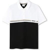BOSS Boys Colour Block Short Sleeve Polo Shirt Size & Fit Regular fit Available in sizes 4 years - 16 years Details Boys Colour Block Short Sleeve Polo Shirt by BOSS Black Colour block Short sleeves Polo collar Button front fastening Material & Care Material Content: 96% Cotton, 4% Elastane - Trimming: 100% Cotton Washing Instructions: Machine Washable - Manufacturers part number: J52339/09B