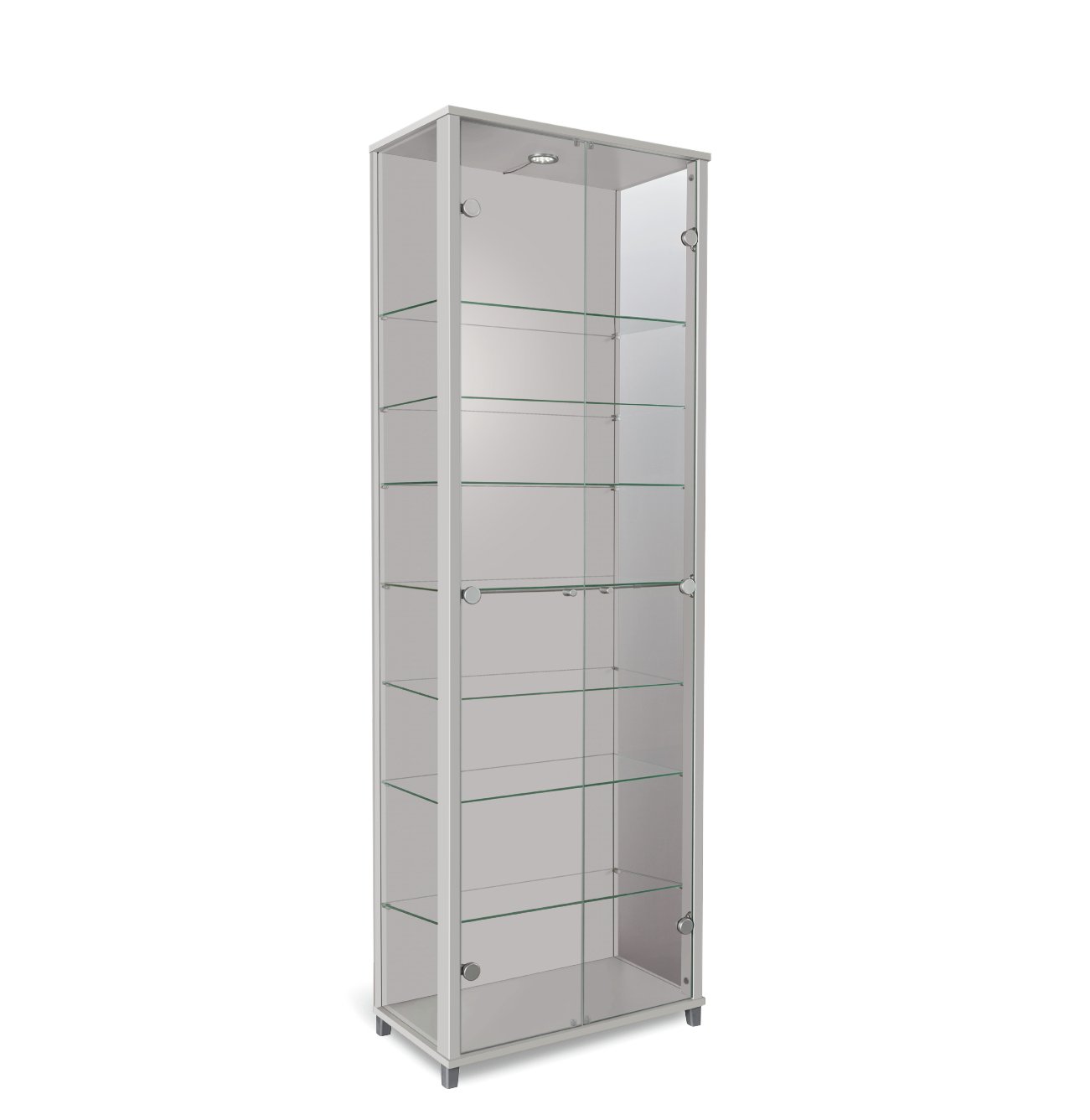 This tall, modern silver display unit is designed to showcase your favourite things. It has glass sides, 2 doors and 7 glass shelves. And its illuminated, so itll look even smarter at night. Silver coloured handles and feet add the finishing touch. Size H172, W58, D32cm. Weight 30kg. Maximum load weight of 20kg. 7 shelves made from glass including 7 fixed shelves. 2 doors made from glass. Silver plastic handles. Non-halogen display lighting. Self-assembly - 2 people recommended. If this product is over ...