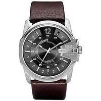 Solid men's Diesel Master Chief watch, with a 44mm stainless steel case, with crown guard extended over part of the dial to give emphasis to the date window. The watch has a high quality wide brown leather strap, and a grey dial with indented baton hour markers. Large amounts of detail for close inspection, as well as a solid and impressive silhouette from the case. Inside the watch is a quartz movement, with day and date feature, and the case offers water resistance up to 10 bar. - Manufacturers part number: M-WAT-1125