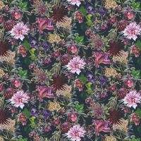 A vibrant floral display featuring vivacious dahlias and anemones. Bring the cheerful ambience of the garden to your space with this show-stopping design. Shown here with pretty pops of pink, green and purple. Set against a dramatic charcoal ground. - Manufacturers part numbers: Albany_38175-6|381756