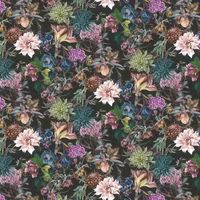 A vibrant floral display featuring vivacious dahlias and anemones. Bring the cheerful ambience of the garden to your space with this show-stopping design. Shown here with pretty pops of pink, green and blue. Set against a dramatic black ground. - Manufacturers part number: Albany_38175-7