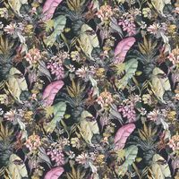 A truly wild design with exotic animals emerging from a tropical floral display. Jungle leaves and pretty flowers create a vibrant nature-inspired design, while fish, parakeets, zebra and giraffes add flamboyant flair. Shown here with pretty pops of pink, green and purple. Set against a dramatic black ground. - Manufacturers part number: Albany_38176-1