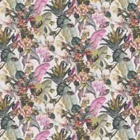 A truly wild design with exotic animals emerging from a tropical floral display. Jungle leaves and pretty flowers create a vibrant nature-inspired design, while fish, parakeets, zebra and giraffes add flamboyant flair. Shown here with pretty pops of pink, green and purple. Set against a fresh white ground. - Manufacturers part number: Albany_38176-3