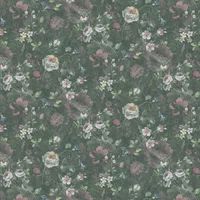A weave textured wallcovering covered in flowers with a shadowy vintage look, includes roses and dahlias. Shown in the dark green colourway. - Manufacturers part number: Albany_38636-2