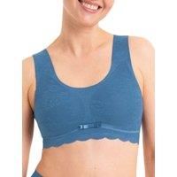 Anita Essential Lace Bralette. Non-wired soft cup bra with breathable lightly padded removable foam cups, all over stretch lace design, wide straps and a hook & eye closure. Product is recommended hand wash only. | Anita Women's Essential Lace Bralette in Blue | Size: 12