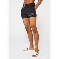 BOSS Mooneye Swim Shorts-Black Size & Fit True to size - order your usual size Available in sizes S - 2XL Details Mooneye Swim Shorts by BOSS Black Breathable, lightweight fabric BOSS branding to the leg Drawstring waistband Side slip pockets Cut high on the legs Material & Care Material Content: 100% PA Washing Instructions: Machine Washable