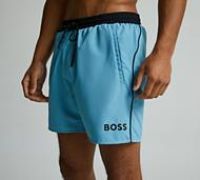 BOSS Starfish Swim Shorts in Light Pastel Blue. Synonymous with fashionable clothing, BOSS gets us ready for the summer with these stylish swim shorts. Crafted from a lightweight polyester material with quick-drying properties, loosely cut with integrated briefs, handy side pockets, contrast side stripe and customary BOSS branding above left leg hem. Cause a real splash this season. Blue Size - S